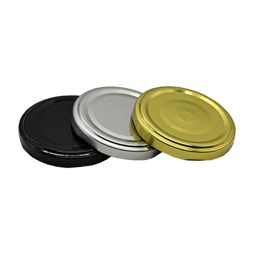 A pack of 63mm twist off replacement safety button jam jar lids available in gold and black. These vinegar-proof lids are FSA approved, BPA free and suitable for home preserving or commercial use.