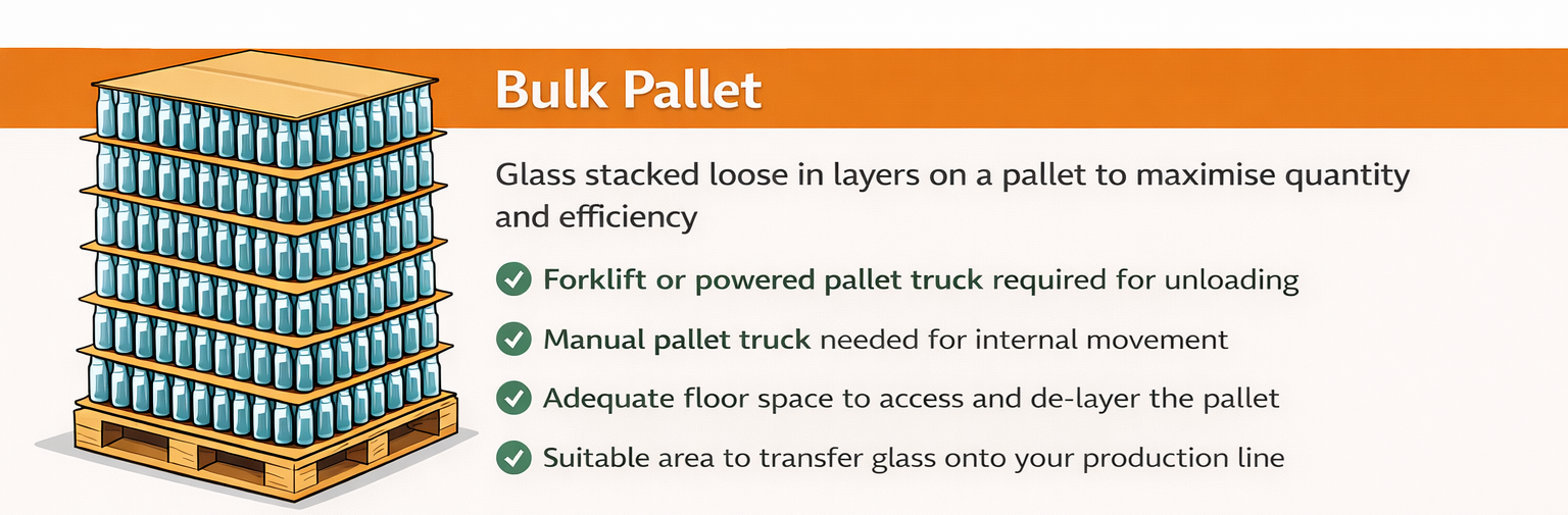 Both bulk and boxed pallets are widely used across the glass packaging industry. The key difference is simply how the glass is packed on the pallet.